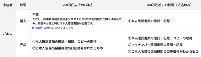 ▼田中貴金属店での店頭での本人確認について